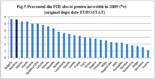Ulterior, Romania a mai avansat 6 pozitii (fig.5) ocupand in 2008 pozitia a doua cu 5,6% din PIB alocat pentru investitii, pe locul unu fiind Bulgaria cu 5,7%. Pe ultimele locuri se alfla Germania si Austria cu 1,5% si respectiv 1,1%.