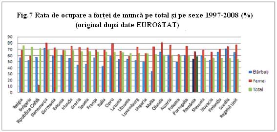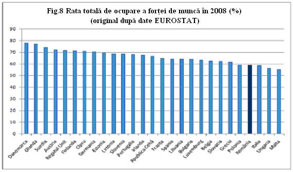 Dupa cum se poate observa in figura 8, in anul 2008 Romania ocupa locul 24 intre tarile Uniunii Europene in ceea ce priveste rata totala de ocupare a fortei de munca cu un procent de 59% fiind urmata de Italia, Ungaria si Malta fiecare avand cate 58,7%; 56,7% si respectiv 55,3%. Pe primul loc in acest caz se afla Danemarca urmata de Olanda cu 78,1% si respectiv 77,2% .