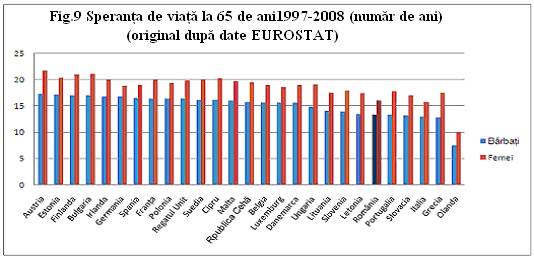 Longevitatea cea mai mare o intalnim la populatia Austriei (fig.9) care atinge 17,3 ani la barbati si 21,8 ani la femei. Romania ocupa din acest punct de vedere locul 22 cu 13,2 ani la barbati si 16 ani la femei.