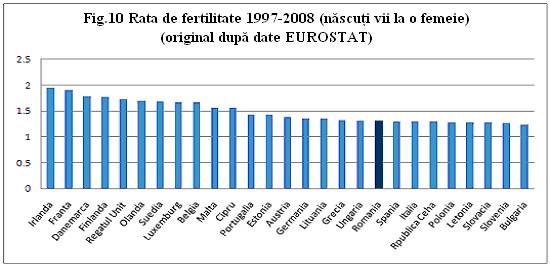 Rata de fertilitate cea mai ridicata o prezentau in anii 1997-2008 Irlanda si Franta (fig.10) cu 1,94 si 1,95 nascutii vii la o femeie. In aceasta perioada Romania avea o rata de fertilitate de 1,31 ceea ce o situa pe pozitia a 19-a intre tarile Uniunii Europene. Valoarea ratei de fertilitate este aproximativ aceeasi pentru ultimele clasate, de la 1,3 la Spania la 1,23 in cazul Bulgariei.