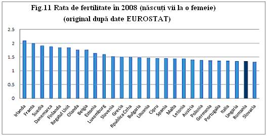 In graficul alaturat se poate observa cum Romania ocupa penultima pozitie din UE in ceea ce priveste rata de fertilitate. Pe primele doua locuri se afla Irlanda si Franta cu 2,1 si respectiv 2 nascuti vii la o femeie.