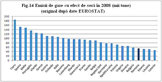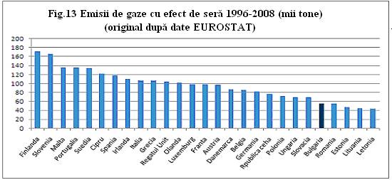 Pe perioada anilor 1996-2008 Romania (fig.13) a ocupat locul 24 cu 54,55 mii tone de emisii de gaze cu efect de sera fiind urmata de Estonia, Lituania si Letonia cu cate 46,3; 44,2 si respectiv 43,5 mii tone de emisii. Pe primul loc in ceea ce priveste emisile de gaze cu efect de sera se afla Finlanda urmata de Slovenia cu 171,8 si respectiv 165,6 mii tone.