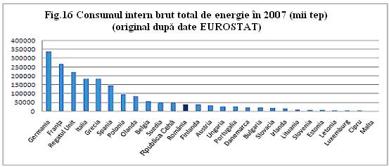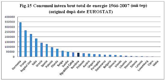 Intre anii 1996 si 2007 Germania (fig.15) se afla pe primul loc in ceea ce priveste consumul intern brut de combustibil, acesta atingand o valoare de 346829,8 mii tep. Romania ocupa in aceasta perioada pozitia 12 cu 40382 mii tep. Ultimile pozitii erau ocupate de catre Cipru si Malta cu 2403 si respectiv 881 mii tep.
