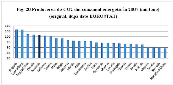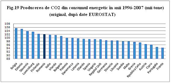 Producerea de CO2 din consumul energetic in anii 1996-2007, rezulta in cantitatea cea mai mare in Belgia 105.3 mii tone (fig.19), urmata de Estonia cu 105, Slovenia la egalitate cu Finlanda 103, iar pe locul 6 Romania cu 102 mii tone de CO2 produs. Ultimul loc in acest clasament negativ (sau mai bine spus acest indice negativ deoarece este direct proportional valoare indice/efect negativ asupra mediului) este ocupat de Franta cu 94 mii tone de CO2 eliberat.