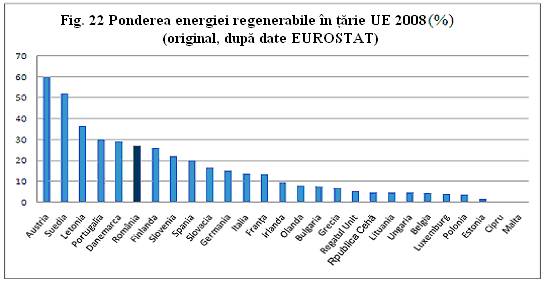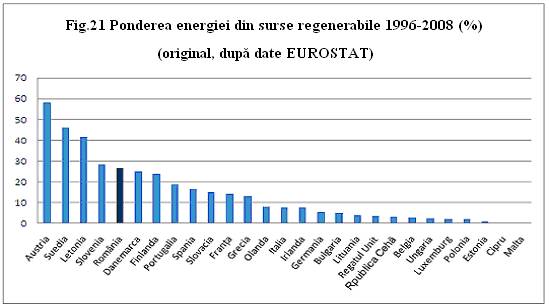 Pe primul loc dupa cantitatea de energie electrica provenita din surse regenerabile in perioada 1996-2008 in Uniunea Europeana este Austria cu 58,1% (fig.21) urmata de Suedia cu 45,7% si Letonia cu 41,5%. Romania se situeaza pe locul 5 cu un procent de 26,2% energie electrica rezultata din surse regenerabile. Pe ultimele locuri se afla la egalitate cu 0% energie electrica rezultata din surse regenerabile Cipru si Malta.