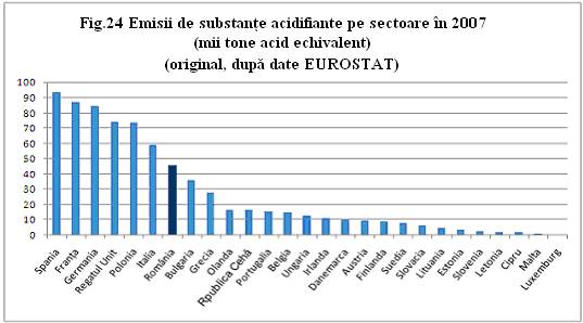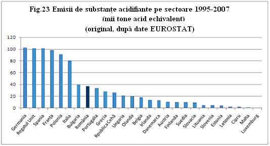 Statele Uniunii Europene cu cele mai mari emisii de substante acidifiante pe sectoare (Fig.23), in perioada anilor 1995-2007 sunt la egalitate Germania, Regatul Unit si Spania cu 100 mii tone acid echivalent urmate indeaproape de Franta si Polonia cu 98 si 91 mii tone acid echivalent. Romania se situeaza pe locul opt dupa Bulgaria cu 36 mii tone acid echivalent in ceea ce privesc emisiile de substante acidifiante pe sectoare. Pe ultimele locuri in emiterea de substante acidifiante pe sectoare se afla Cipru, Malta si Luxemburg cu cate 2,2 mii tone acid echivalent, o mie tone acid echivalent si 0,5 mii tone acid echivalent