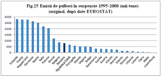 Cea mai mare cantitate de pulberi in suspensie din perioada 1995-2008 este realizata de Finlanda (fig.25) care a atins 2809 mii tone. Aceasta este urmata de Franta si Regatul Unit cu 2784 si respectiv 2775 mii tone. Romania a emis in aceeasi perioada 786 mii tone de pulberi in suspensie fapt care i-a asigurat locul 10 in clasamentul acestui indice. Ultimul loc este ocupat de Luxemburg cu 12,3 mii tone.