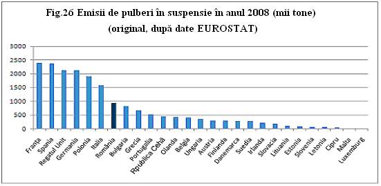 In anul 2008, Franta urca pe prima pozitie cu 390 mii tone de emisii pulberi mai putin decat in perioada anterioara dar prima totusi intre statele Uniunii Europene pentru acest an (fig.26). Romania trece pe locul 7 cu o valoare crescuta a emisiilor de pulberi in suspensie la 926 mii tone. Ultimele clasate raman la fel ca si in clasamentul anterior Letonia, Cipru, Malta si Luxemburg cu 64 mii tone, 39 mii tone 16 mii tone si respectiv 7 mii tone emisii pulberi in suspensie.