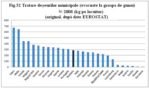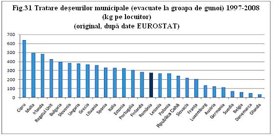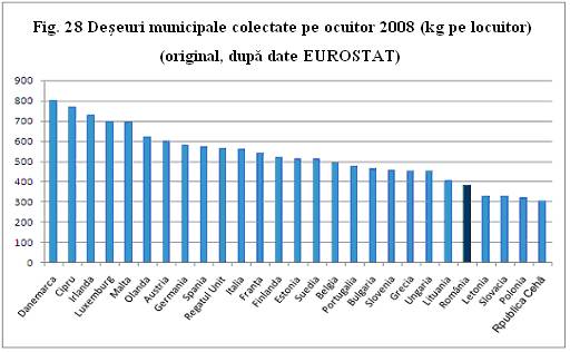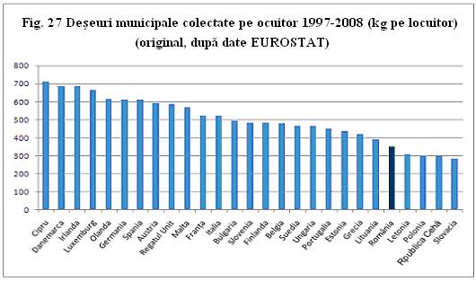 Din fig.27 reiese ca Romania ocupa locul 23 in ceea ce priveste colectarea deseurilor municipale cu 351,5 kg de desuri colectate pe locuitor pe perioada anilor 1997-2008. In aceeasi peroada Cipru, Danemarca si Irlanda ocupau primele trei pozitii cu 712 kg, 687 kg si 686 kg deseuri colectate pe locuitor.Ultimele doua pozitii erau ocupate de Republica Ceha si Slovacia fiecare colectand circa 297 kg si respectiv 280 kg de deseuri pe cap de locuitor.