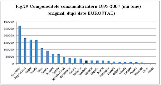 In figura alaturata (Fig.29) se poate observa ca, in ceea ce priveste indicatorul componentelor consumului material intern, Germania conduce detasat avand o valoare de 271250 mii tone urmata la mare distanta de Regatul Unit cu 182936 mii tone si de Belgia cu 171591 mii tone. Locul 13 in acest clasament este ocupat de Romania care are o valoare a indicatorului componentelor consumului material intern pe perioada anilor 1995-2007 de 22143 mii tone. Ultimele doua locuri sunt ocupate de Cipru si Malta avand fiecare cate 1521 mii tone si respectiv 427 mii tone.