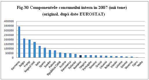 In anul 2005 (fig.30) situatia clasamentului se modifica usor printr-o crestere a valorii acestui indicator si printr-o inversare a clasamentui. Astfel Franta si Belgia devanseaza Regatul Unit ocupand locul trei si doi iar prima pozitie este in continuare pastrata de Germania. Atat Romania cat si ultimele doua clasate Cipru si Malta isi pastreaza aceleasi pozitii si in clasamentul anului 2007 pentru componentele consumului material intern.