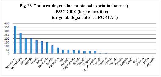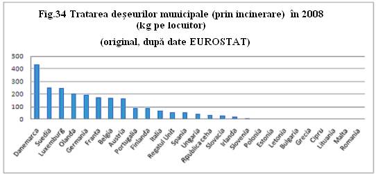 Clasamentul acesta se pastreaza acelasi pentru anul 2008 (Fig.34) cu Danemarca pe primul loc urmata de Suedia si Luxemburg dar prezinta cantitati mai scazute de deseuri incinerate pe locuitor pentru majoritatea statelor mai putin pentru Danemrca (caz in care cantitatea creste de la 369 kg pe locuitor la 420 kg pe locuitor). Ultimele locuri sunt ocupate de Grecia, Cipru, Lituania, Malta si Romania fiecare avand valori reduse ale tratarii deseurilor municipale prin incinerare la 0 kg pe locuitor, practic in 2008 acestea nu au tratat astfel deseurile municipale.
