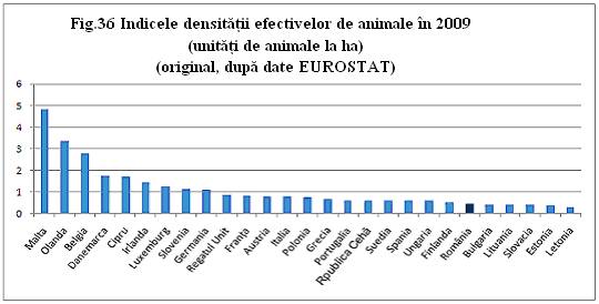 Romania se afla printre ultimele clasate, pe locul 22 cu 0,43 unitati de animale la ha, urmata de Bulgeria cu 0,4 unitati, Slovacia cu 0,38 de unitati, Estonia cu 0,35 de unitati si Letonia cu 0, 28 de unitati.