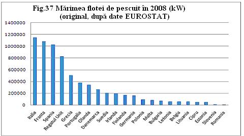 Italia, Franta si Spania sunt liderele Uniunii Europene (fig.37) in ceea ce priveste marimea flotei de pescuit cu 1149081 kW, 1082260 kW, 1029530 kW. Pe ultimul loc al clasamentului se situeaza Romania care are 6121 kW puterea motoarelor. Dupa cum am mentionat si anterior, la descrierea indicatorului, acesta nu arata efectiv cotele de pescuit sau marimea capturilor ci doar puterea motoarelor ambarcatiunilor de pescuit. La identificarea unui alt indicator care sa arate efectiv dimensiunile capturilor acest grafic ar putea arata diferit.