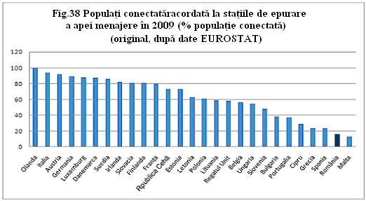 Cu cat procentul de conectare la statiile de epurare a apelor menajere este mai mare, cu atat mediul are mai putin de suferit pe urma activitatii antropice. Astfel prima pozitie intre statele Uniunii Europene este ocupata de Olanda care are un procent de conectare de 99,5 urmata de Italia cu 93,6% si Austria cu 91,8%. Si de aceasta data Romania ocupa una din ultimele pozitii si anume locul 26 cu 16% fiind precedata de Spania cu 23,8%, pe ultima pozitie fiind Malta cu 13% din populatia sa conectata la statii de epurare a apelor menajere.