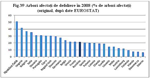 Dupa cum se observa in figura 39, statul Uniunii Europene cel mai afectat de defoliere este Republica Ceha cu 51,1 % urmata de Ungaria cu 41,7 %. Romania prezenta in 2008 un procent de 21,1 arbori afectati de defoliere. Statul cel mai putin afectat de defoliere este Estonia cu 6,2% precedat de Danemarca cu 7,2 si Irlanda cu 7,4%