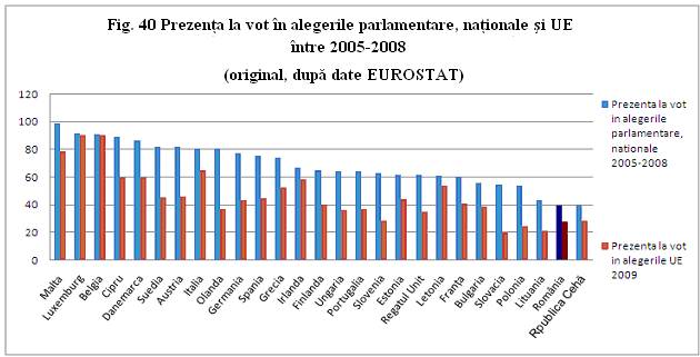 Din figura 40 reiese ca singurele doua tari, la gare gradul de participare la alegerile nationale este egal cu acela de la alegerile UE (91%), sunt Luxemburg si Belgia (state in care prezenta la vot e obligatorie) iar diferenta cea mai mare, o inregistreaza Slovacia cu 54,7% participare la vot in alegerile nationale fata de 19.6% participare la vot in alegerile UE.