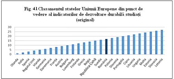 Ca o medie a locurilor ocupate de tara noastra (fig.39), pozitia Romaniei in Uniunea Europeana, in functie de cei 23 de indicatori de dezvoltare durabila studiati in cadrul acestei lucrari, este a 17-a, precedata fiind de Suedia si urmata de Polonia.