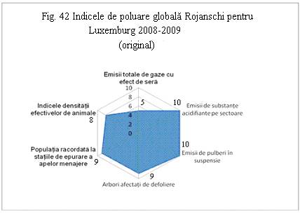 Pentru Luxemburg (fig.42), valoarea indicelui de poluare Rojanschi este de 1,12 ceea ce inseamna ca, mediul natural este usor supus activitatii umane, in limitele admisibile. Nota cea mai scazuta a fost obtinuta in cazul emisiilor de gaze cu efect de sera. Aceasta valoare incadreaza Luxemburgul in cea de-a doua grupa valorica in ceea ce priveste afectarea antropica a mediului ceea ce e de remarcat e faptul ca Luxemburg are valoarea cea mai apropiata de 1 ceea ce inseamna ca activitatea antropica afecteaza in foarte ica masura mediul natural.