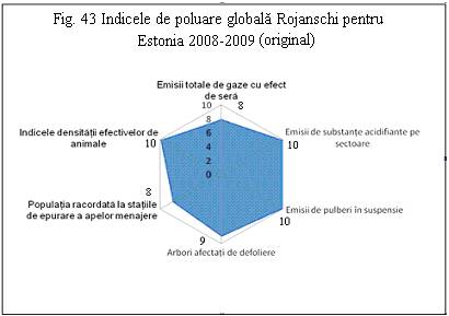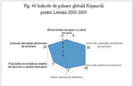 Valori mai scazute inregistreaza Letonia (fig.46) pentru emisii de gaze cu efect de sera (8), arbori afectati de defoliere (7) si populatia conectata la statiile de epurare a apelor menajere (7). Letonia obtine deasemenea note mici la emisii totale de gaze cu efect de sera (8), la arbori afectati de defoliere 7, iar la populatia conectata la statiile de epurare a apelor menajere 7. Deoarece acest stat a obtinut nota maxima la ceilalti trei indicatori urmariti pentru realizarea indicelui de poluare globala Rojanschi, locul sau in clasamentul statelor Uniunii Europene este in grupa a doua, cu mediul natural usor supus activitatii umane, in limitele admisibile.