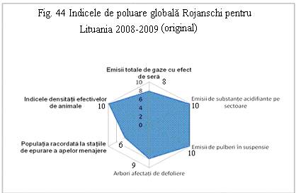 Lituania (fig.44) a realizat o valoare a indicelui de poluare globala de 1,31 si se situeaza deasemenea in grupa a doua in ceea ce priveste gradul de afectare a mediului de catre activitatea antropica. Desi are emisii extrem de reduse de substante acidifiante si pulberi in suspensie, precum si indicele efectivelor de animale, are totusi emisii de gaze cu efect de sera pentru care a obtinut nota opt si arbori afectati de defoliere pentru care a obtinut nota noua si populatie conectata la statii de epurare a apei menajere pentru care a obtinut nota opt. Per total, mediul natural al Lituaniei, din punct de vedere al indicatorilor urmariti, este usor supus activitatii umane, in limitele admisibile.