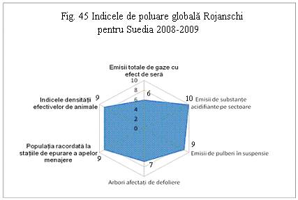 In fig.45 este reprezentata grafic Suedia, din punct de vedere al indicelui de poluare globala. Valoarea indicelui, pentru acest stat, este de 1,33 asemenea indicelui pentru Letonia dupa cum vom vedea in fig.46. Valoarea indicelui plaseaza cele doua state, Suedia si Letonia in grupa a doua, a statelor care afecteaza mediul natural datorita activitatii umane, in limitele admisibile. Notele obtinute de Suedia pentru emisii de gaze cu efect de sera si pentru arbori afectati de defoliere sunt mici si anume 6 si respectiv 7. In schimb, notele obtinute pentru emisii acidifiante, de pulberi, populatie conectata la statiile de epurare a apei menajere si indicele densitatii efectivelor de animale au fost mari: 10, 9, 9 si 9.