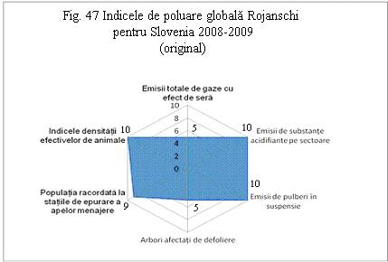 Indicelel Rojanschi pentru Slovenia are valoarea de 1,55 si incadreaza astfel acest stat in cea dea doua grupa a Uniunii Europene, in care mediul naturale este usor supus activitatii umane, in limitele admisibile. Acest stat primeste note extrem de mici pentru emisiile de gaze cu efect de sera si pentru arbori afectati de defoliere (5), dupa cum se poate observa in figura 47.