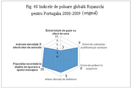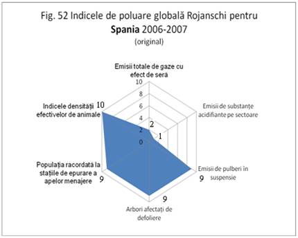 Surprinzator in cazul Spaniei (fig54) este faptul ca, in timp ce emisiile de gaze cu efect de sera si emisiile de substante acidifiante sunt foarte ridicate, efectul asupra arborilor este extreme de scazut. Acest fapt poate indica fie o mutare a poluarii (transfrontiera) dupa cum putem observa in cazul Portugaliei care desi are nota 9 la emisii de substante acidifiante, are 8 la gradul de defoliere al padurilor, fie o favorizare a acestei tari din punct de vedere geografic (Oceanul Atlantic, Marea Mediterana) Valoarea indicatorului Rojanschi este 2,12 Spania situandu-se in grupa a III-a.