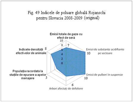 Slovacia se situeaza in grupa a doua dupa valoarea indicatorului Rojanschi realizata si anume 1,79. Acest stat elimina o cantitate insemnata de emisii de gaze cu efect de sera (fig.49) motiv pentru care primeste nota 7 pentru acest indicator si nota 6 pentru arbori afectati de defoliere. Nivelul de conectare la statiile de epurare a apei menajere este extrem de redus, doar 48,3%, astfel nota obtinuta in acest caz e 5. Efectivele de animale sunt crescute, 1,13 unitati de animale la ha asigurandu-i Slovaciei nota 7.
