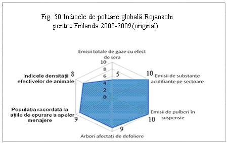 O nota mica (5) obtine Finlanda (fig.50) pentru emisiile sale de gaze cu efect de sera, deasemenea primeste 8 pentru efectivele usor crescute de animale. Nota 9 este obtinuta pentru procentul mic de arbori afectati de defoliere si pentru populatia conectata la statiile de epurare ale apei menajere. Nota maxima este obtinuta de catre Finlanda pentru cantitatea foarte mica de emisii de substante acidifiante si de cele de pulberi in atmosfera. Toate aceste valori au dus la obtinerea valorii de 1,8 a indicelui de poluare Rojanschi ceea ce ii asigura Finlandei un loc in grupa a doua.
