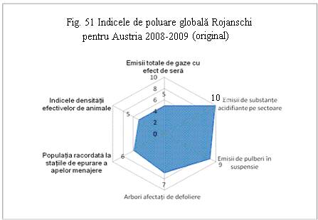 Conform datelor furnizate de Oficiului de Statistica al Comunitatilor Europene (EUROSTAT) indicele Rojanschi, pentru Austria (fig.51), atinge valoarea 2 fapt care o situeaza in cea de-a doua grupa. Singura nota maxima a acestui stat este obtinuta pentru cantitatea scazuta de emisii acidifiante si 9 pentru emisiile de pulberi in suspensie. In schimb numarul mare de arbori afectati de defoliere, slaba conectare a populatiei la statiile de epurare (52%), efectivele crescute de animale si emisiile ridicate de gaze cu efect de sera ii aduc Austriei note mici (7,6,5 si 5).