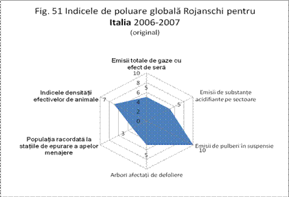 Situatia Italiei (fig.53) din punct de vedere al indicatorilor alesi, pe perioada anilor 2000-2009 se prezinta in felul urmator: populatia foarte slab conectata la statiile de epurare a apei menajere (28,9%), emisii ridicate de gaze cu efect de sera (106,9mii tone), emisii ridicate de substante acidifiante (59,24 mii tone acid echivalent). Desi compararea emisii de substante acidifiante-arbori afectati de defoliere al Italiei nu este asemanator cu cel al Bulgariei, se poate observa ca cei doi indicatori sunt in legatura direct proportionala. Densitatea efectivelor de animale este usor crescuta drept pentru care, Italia primeste nota 7 pentru acest indicator de dezvoltare durabila.