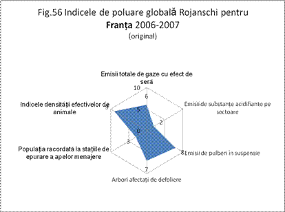 In cazul Frantei (fig.58), valoarea indicelui de poluare globala Rojanshi este de 2,28 fiind situata in grupa a III-a a statelor Uniunii Europene a caror activitate antropica determina tulbutari ale formelor de viata din mediul natural. Cantitatea de emisii de gaze cu efect de sera este destul de ridicata (94,2mii tone) astfel Franta obtine nota 6 pentru acest indicator, cea a emisiilor de substante acidifiante este deasemenea mare (87 mii tone acid echivalent). O nota mica primeste Franta pentru procentul scazut al populatiei conectate la statiile de epurare a apei menajere (nota 3).