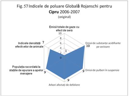 Cea mai mare cantitate de emisii de gaze cu efect de sera intalnita pana acum la un stat al Uniunii Europene este cea a Ciprului (fig.59), 185,3 mii tone motiv pentru care, aceasta tara primeste nota 1. Densitatea efectivelor de animale este usor crescuta astfel nota obtinuta este 7. Valoarea indicelui de poluare globala este de 2,47 ceea ce plaseaza acest stat in grupa a III-a.