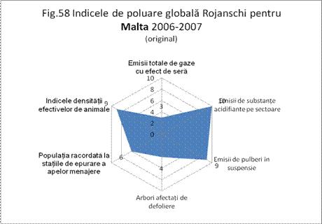 Malta (fig.60) are emisii extrem de scazute de substante acidifiante si de pulberi in suspensie precum si un indice al efectivelor de animale bun (nota 10, 9, 9) dar si valori ridicate in ceea ce priveste emisiile de gaze cu efect de sera (149mii tone si nota 3), un procent ridicat de arbori afectati de defoliere (41,7% si nota 4) si un procent scazut al populatiei conectate la statiile de epurare a apelor menajere (54,7% si nota 6). Valoarea indicelui Rojanschi pentru acest stat este 2,48.