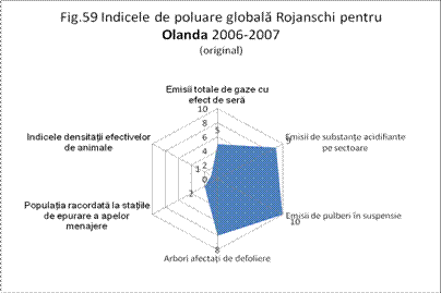 Olanda (fig.61) are emisii ridicate de gaze cu efect de sera (97,4 mii tone) pentru care primeste nota 5. Desi acest stat are note mari pentru cantitatea mica de emisii de substante acidifiante si cele de pulberi in suspensie precum si pentru numarul de arbori afectati de defoliere (9,10 si 8), notele pentru ceilalti indicatori luati in discutie sunt mici si anume 2 pentru procentul populatiei conectata la statiile de epurare ale apei menajere (13%) si nota 1 pentru indicele densitatii efectivelor de animale (4,8 unitati de animale la ha). Valoarea Ipg pentru Olanda este de 2,5 acesta clasand-o in grupa a III-a de state ale Uniunii Europene a caror influenta antropica asupra mediului determina perturbari ale formelor de viata.