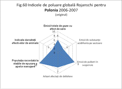 Polonia (fig.62) obtine nota 6 pentru emsiile mari de gaze cu efect de sera, nota 3 pentru emisiile de substante acidifiante si corelat cu acesta nota 7 pentru defolierea arborilor. O carte de vizita buna a Poloniei este faptul ca procentul de conectare a populatiei la statiile de epurare a apei menajere este de 99,5% motiv pentru care obtine nota 10 pentru acest indicator. Densitatea efectivelor de animale este ridicata acesta fiind un factor atat de stress asupra mediului cat si poluant drept pentru care nota obtinuta pentru acest indice de catre Polonia in anii 2006-2007 este 5. In acest caz valoarea indicelui de poluare globala este 2,65.