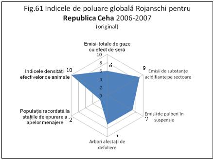 Republica Ceha (fig.63) are emisii de gaze cu efect de sera ridicate pentru care primeste nota 6 si emisii de pulberi in suspensie pentru care primeste nota 7. Procentul populatiei racordate la statiile de epurare a apei menajere este extrem de redus (16%) nota obtinuta de catre acest indice fiind 2. In total, valoarea Ipg ajunge sa fie 2,72 ceea ce arata ca suprafata reala in ceea ce priveste indicele de poluare global este redusa. Se poate observa in figura alaturata ca in cazul Republicii Cehe, suprafata reala este mult mai restransa decat suprafata ideala fapt care indica un mediu afectat de activitatea antropica intr-o mai mare masura.
