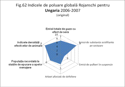 Ungaria (fig.64) are valoarea indicelui Rojanschi de 2,75 cea ce o situeaza in grupa a III-a. Note mici obtine acest stat pentru emisiile crescute ale pulberilor in suspensie (2), pentru procentul ridicat de arbori afectati de defoliere (5) si pentru procentul scazut al populatiei conectate la statiile de epurare a apei menajere. Zonele cele mai afectate ale graficului in cazul acestui stat sunt emisiile, arborii afectati de defoliere si procentul scazut de conectare la statiile de epurare, acestea ducand la reducerea suprafetei reale.