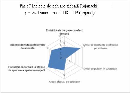 Situatia Danemarcai (fig.65) din punct de vedere al indicatorilor alesi, pe perioada anilor 2007-2007 se prezinta in felul urmator: populatia bine conectata la statiile de epurare a apei menajere (nota 9 cu 87,4%), emisii ridicate de gaze cu efect de sera (nota 5), emisii scazute de substante acidifiante (nota 9) si emisii crescute foarte mult de pulberi in atmosfera (nota 1). Se observa in fig. 64 ca, defolierea padurilor se datoreaza in mare parte emisiilor din atmosfera si in special cantitatii crescute de pulberi in suspensie. Densitatea efectivelor de animale este usor crescuta drept pentru care acest stat primeste nota 7 pentru acest indicator de dezvoltare durabila.