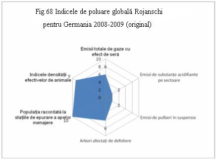 In cazul Germaniei (fig.68), valoarea indicelui de poluare globala Rojanschi este de 3,20 fapt care o situeaza pe aceasta tara a Uniunii Europene in a IV-a grupa a clasamentului statelor Uniunii Europene in care mediul natural este supus activitatii umane, producand tulburari formelor de viata.