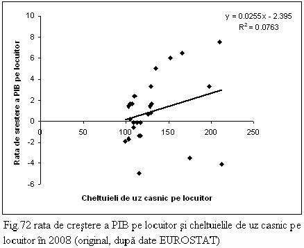 In figura alaturata (fig.72) se poate urmarii diagrama de dispersie pentru corelati intre rata de crestere a PIB pe locuitor si cheltuielile de uz casnic pe locuitor in 2008. Panta dreptei obtinuta prin corelarea celor doi incicatori de dezvoltare durabila este ascendenta (crelatie directa) fapt care indica o conexiune pozitiva intre rata de crestere a PIB pe locuitor si cheltuielile de uz casnic pe locuitor. Valoarea pantei este de R = 0,25 fapt care indica o dependenta ridicata intre cei doi parametri. Practic, atunci cand creste procentul din PIB alocat pe locuitor, cresc si cheltuielile casnice in raport de 0.25:1.