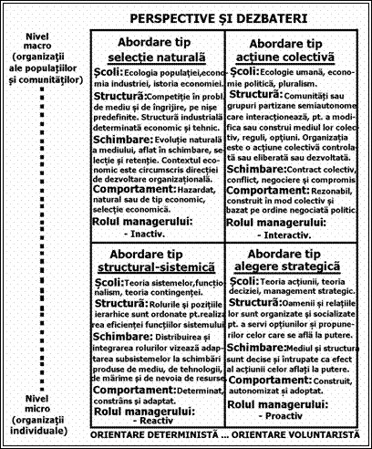 Schema de mai sus ne permite sa sintetizam teoriile asupra organizatiilor si managementului acestora in 3 mari categorii, care corespund si perspectivelor actuale psihosociologice: perspectiva functionalista (rationalista), perspectiva conflictualista (socio-politica) si perspectiva interactionista (interpretativa) (William Kornblum, 1988 - Sociology in a Changing World, p. 19-20; Ioan Mihailescu, 2000 - Sociologie generala. Concepte fundamentale si studii de caz, p. 22-24).