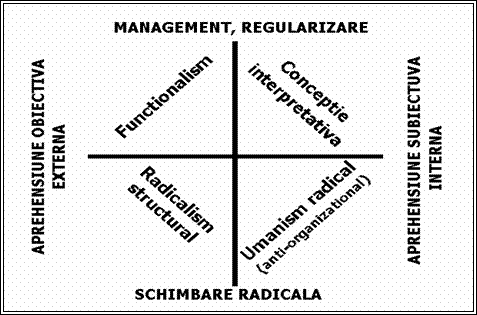 Psihosociologii americani Burrell si Morgan au folosit un alt model pentru a clasifica totalitatea teoriilor explicative asupra organizatiilor, in baza utilizarii a patru mari paradigme, pe care le reprezentam mai jos si apoi le analizam:
