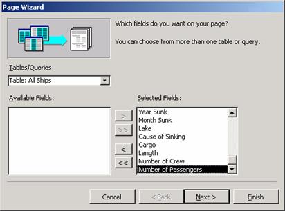 Select the fields that you want your data access page to include. To base the data access page on the full All Ships table, select all the fields by clicking the double forward arrow. Click Next.