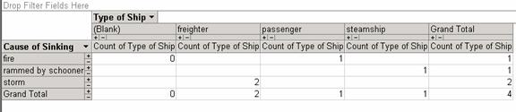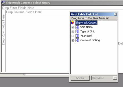 In the PivotTable Field List dialog box, drag each field to the place where you want it to appear in the PivotTable view. For example, if you want to compare types of ships and causes of sinking, drag the Type of Ship field to the area for column fields, and drag the Cause of Sinking field to the area for row fields.