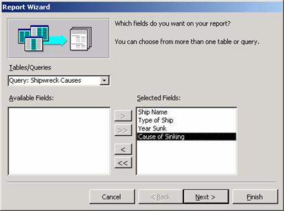 In the Tables/Queries list box, click the table or query from which you want to generate a report. For example, select the Shipwreck Causes query from the list.