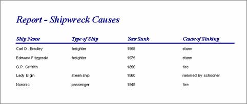 After you and your students add information to the Shipwrecks database, you may want your students to report on some aspect of the data they've collected. Reports let you customize the display of information from the database. You can select the data you want to include-for example, a particular query-and then select the report layout from a variety of design and 141d316b format options. You can insert pictures; add headers, footers, and page numbers; group the information; and change the background colors, among other things.
