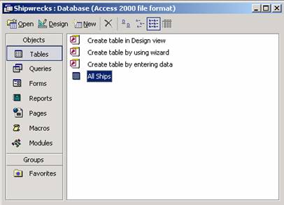 You create and open database objects from the Access 2002 database window, which lists the objects in the left pane of the window. When you click one of the first five items, the right pane gives options for creating the object, and it shows all existing objects of that type in the database. You can open an object by double-clicking it.