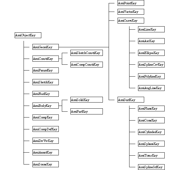 Keys are C++ objects grouped in a terse hierarchy that provides users with type checking and hierarchical characterization. Because the MCAD API uses a functional interface to export functionality, methods are not present in the object key hierarchy. Keys are passed and returned as arguments of API functions. This approach insulates users from changes in the MCAD API implementations that might cause applications to break. The functions fully use the key hierarchical characterization, so that at compile time inappropriate key types cannot be passed into the function.